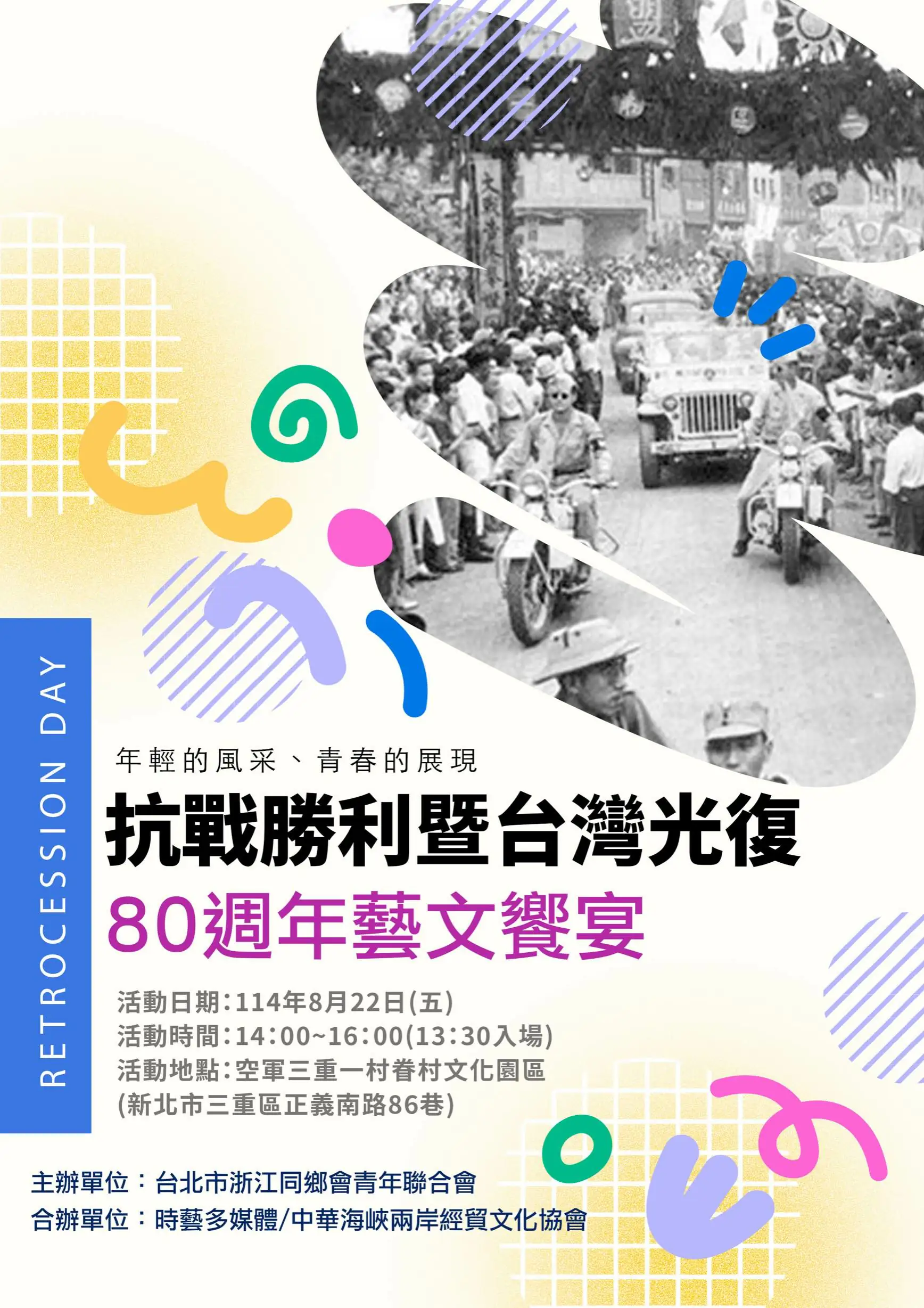 2025年8月22日,一場主題爲“抗戰勝利暨臺灣光復80週年藝文饗宴”的活動由台北市浙江同鄉會青年聯合會主辦,在新北市三重區《空軍三重一村眷村文化園區》隆重舉行。這次活動不僅是一場藝文盛宴,更是對歷史的深刻反思和對未來的熱烈期待。