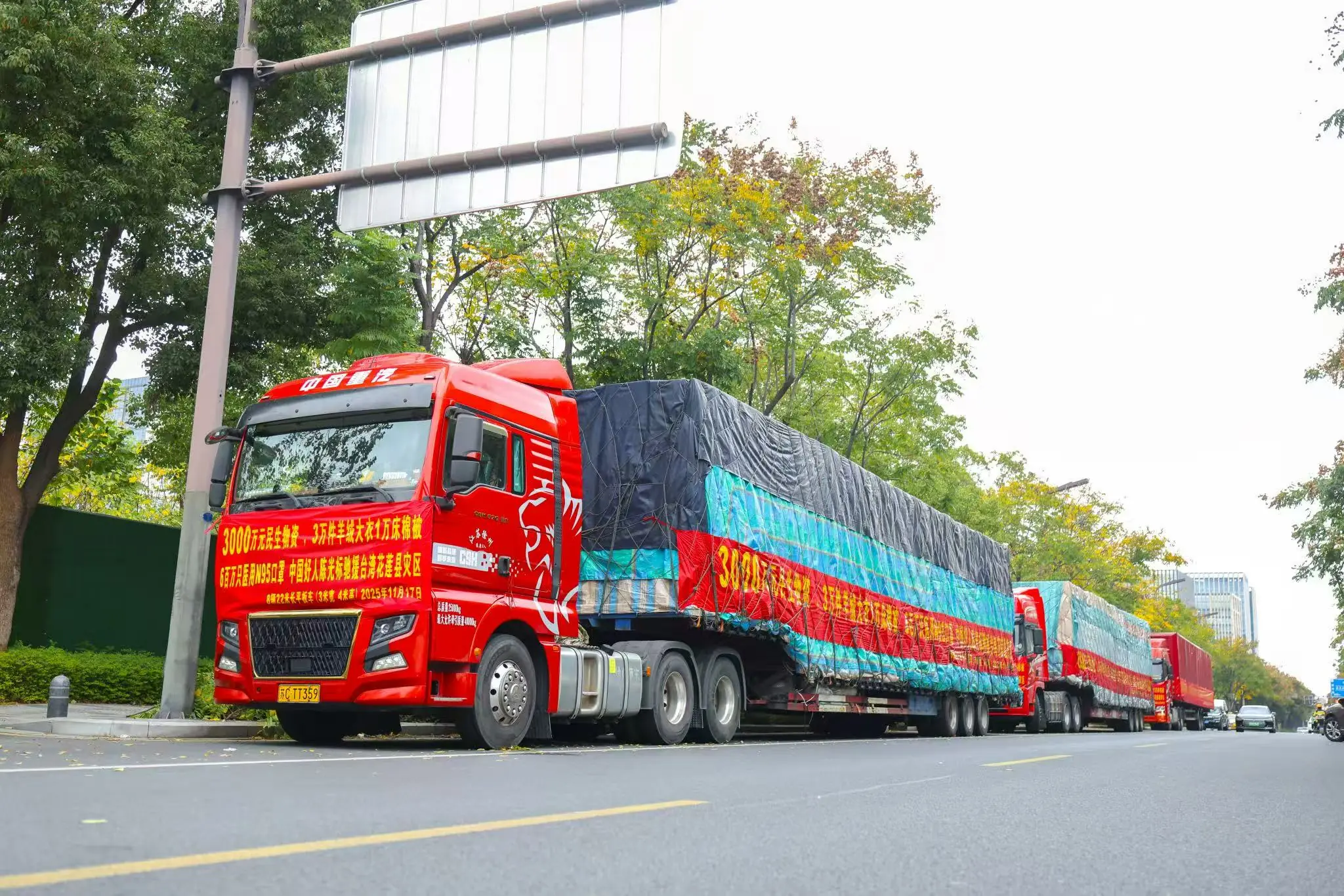 11月17日,在南京,22米長的大平板車、3米寬約4米高共8輛大貨車,載著滿滿的愛心物資整裝出發,場面令人動容。花蓮縣紅十字會專員表示:”這些物資正是時候,特別是寒流來襲,羊絨大衣和棉被將成爲災民最溫暖的依靠。”
