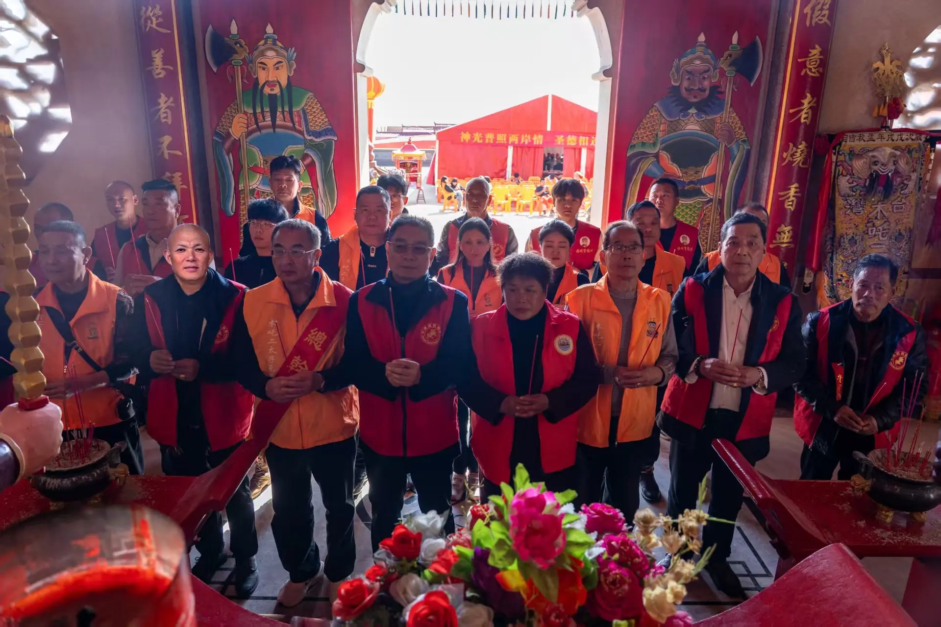 在莊嚴肅穆的山岐宮大殿前,兩岸參香團與信眾並肩而立,手持清香,虔誠祭拜。這一刻,袅袅青煙緩緩升騰,淡化了海峽的隔閡,凝聚起兩岸共同的祈願。